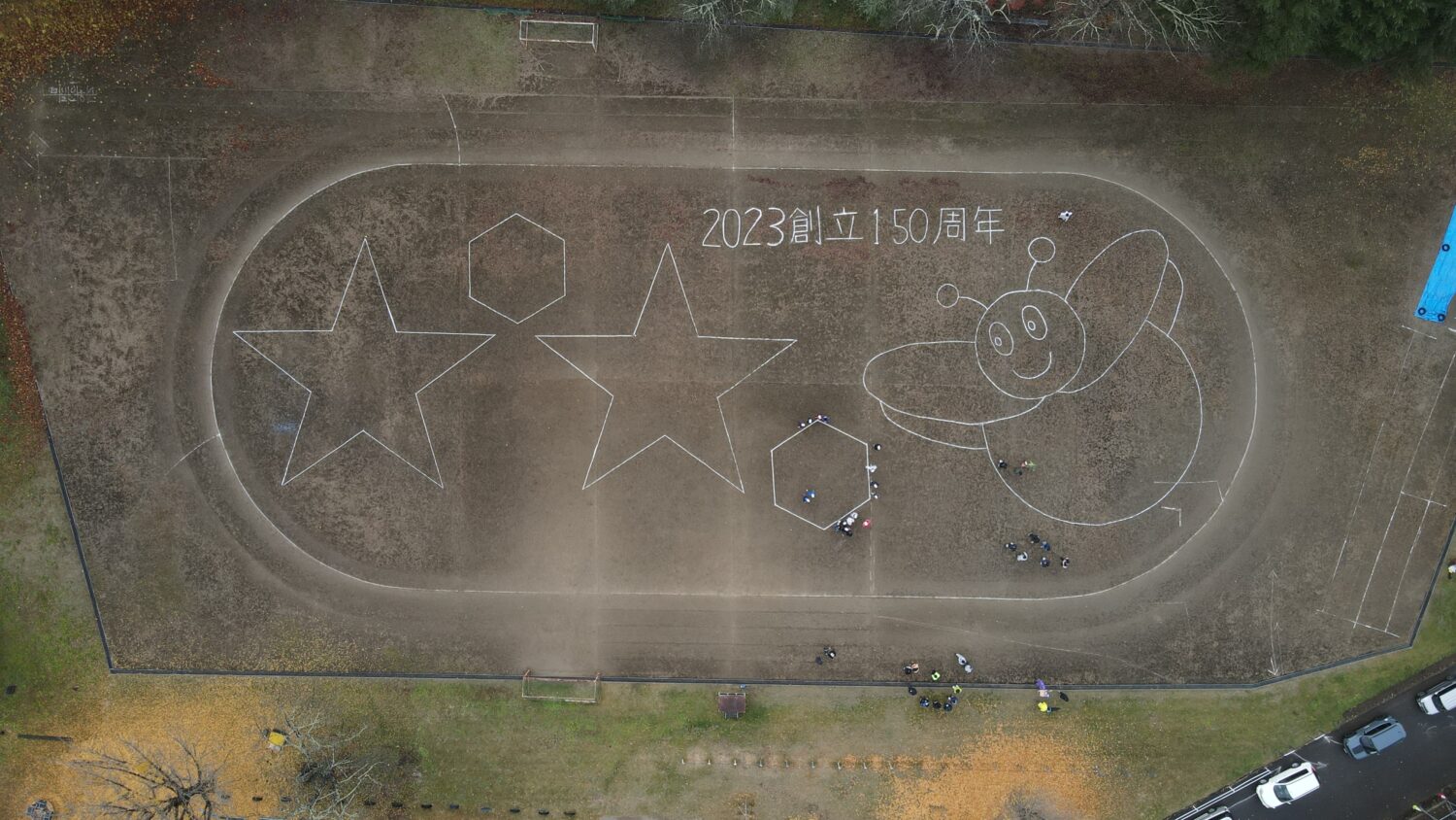 調査士説明のもと、測量体験、歩測ゲーム等を行い、校庭に大きな図形を描きました。